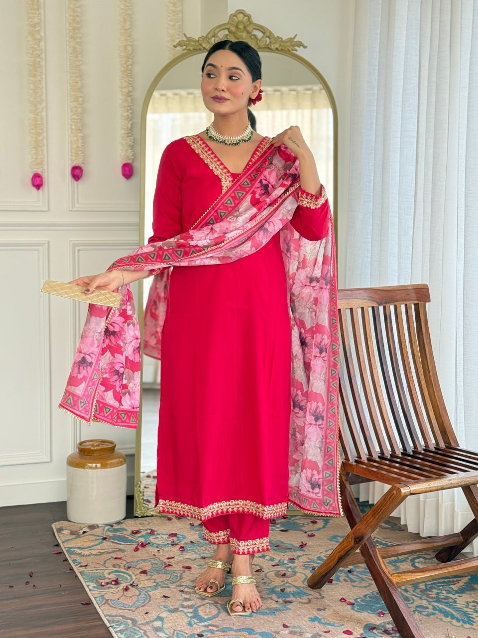 Shop the Elegant Viscose Slub Embroidered Kurti Set with Pant & Chinon Dupatta. Available in sizes S to XXL. Premium quality, perfect for festivals, parties, and special occasions at MyFashion.