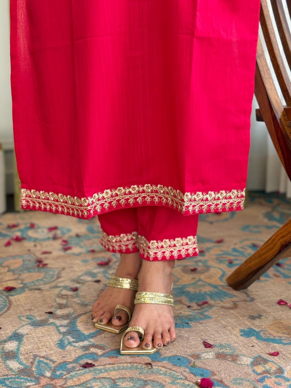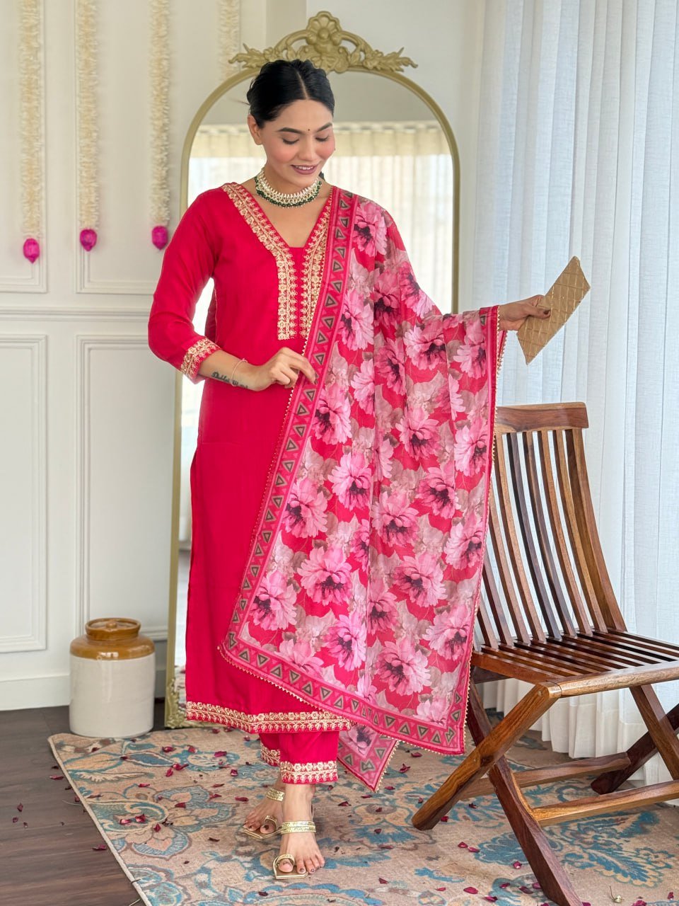 Elevate your ethnic style with this Viscose Slub Embroidered Kurti with Pant & Dupatta Set. Designed for comfort and elegance, this outfit features a soft Viscose Slub Kurta and Pant paired with a graceful Chinon Dupatta, perfect for festive events, parties, and casual celebrations.